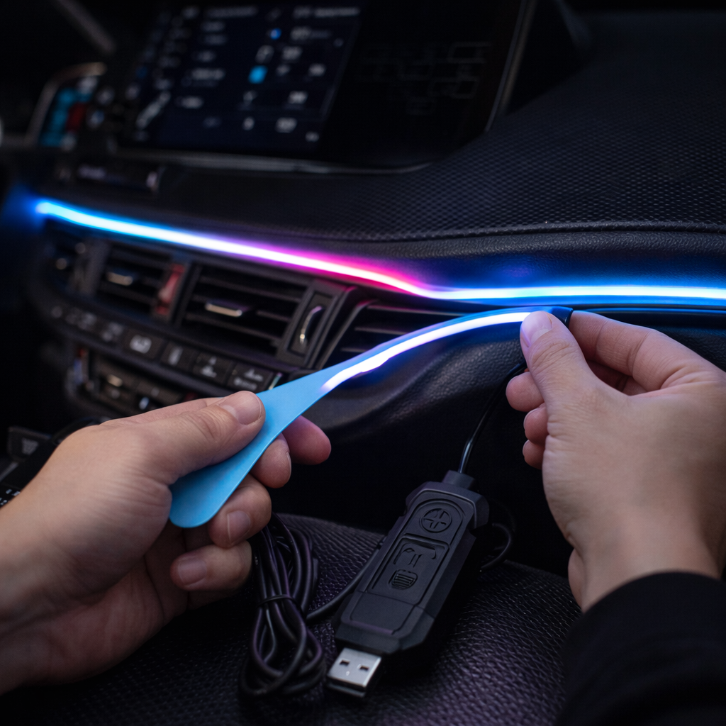 Wystarczy wsunąć listwę w szczeliny deski rozdzielczej lub drzwi i podłączyć USB.